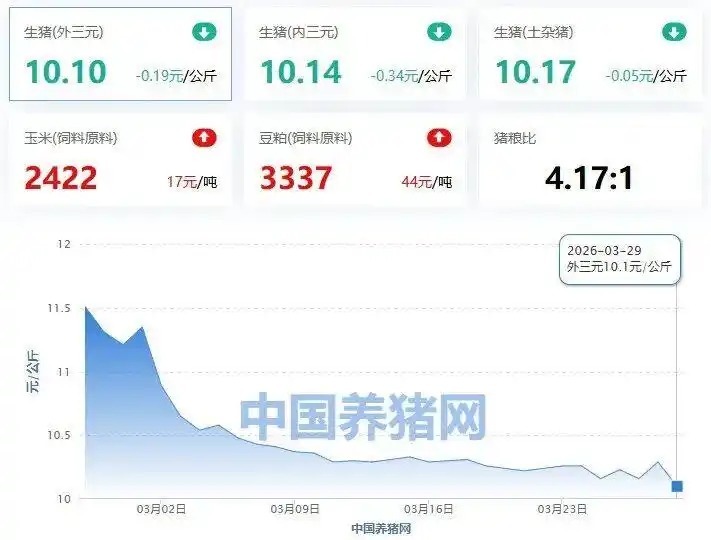 据农业农村部最新监测数据,3月第3周,全国30个监测省份生猪价格全部下跌,生猪平均价格为每公斤11.05元,同比大跌28%。该价格创2018年6月以来新低。农业农村部全国重点农产品市场信息平台数据显示,截至3月27日,瘦肉型白条猪出厂价格指数已降至2024年同期以来新低。
